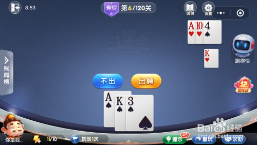 跑得快打出一张A,接着打出一张4,然后我打出一张K就过关了。