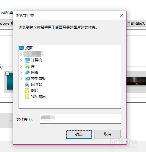 在打开的桌面布景窗口页面中,我们可以点击"浏览"文件夹,然后选择含有桌面布景图片的文件夹,点击"确定"按钮即可。