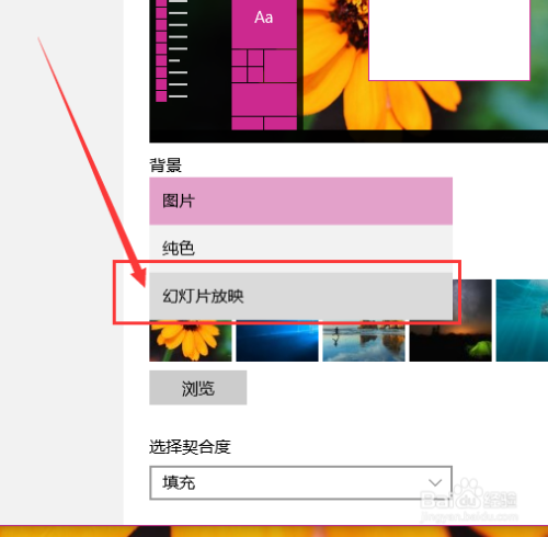 进入个性化设置页面之后,首先进入的就是桌面布景图案设置,在布景图案设置中,需要选择桌面布景的转变体例,所以这里先点击如下图所示的位置,选择“幻灯片放映”选项。