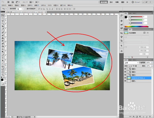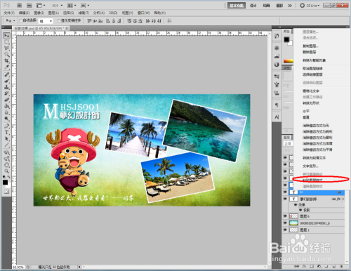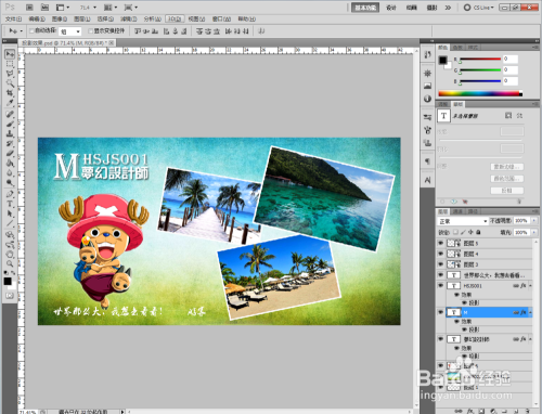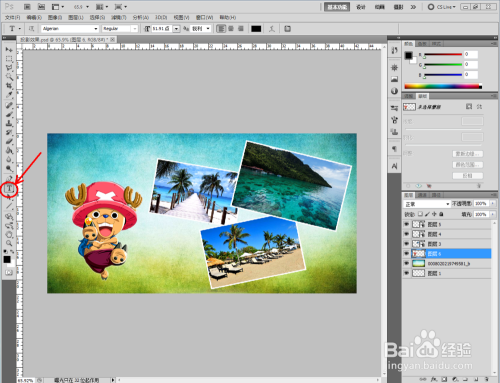 打开Photoshop(CS5)软件,将我们找好的一向图片打开作为布景图层。将找好的分层素材拉进来排好版面后,点击【文字东西】,输入文字内容,并调好文字的大小、颜色、字体等参数;