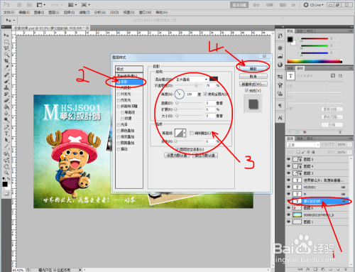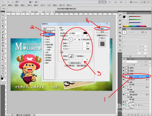 双击“梦幻设计师”文字图层,弹出图层样式对话框。点击【投影】,设置好参数(如图所示)。完当作后,鼠标右键点击该图层,点击【拷贝图层样式】,选中别的两个文字图层,右键点击【粘贴图层样式】;