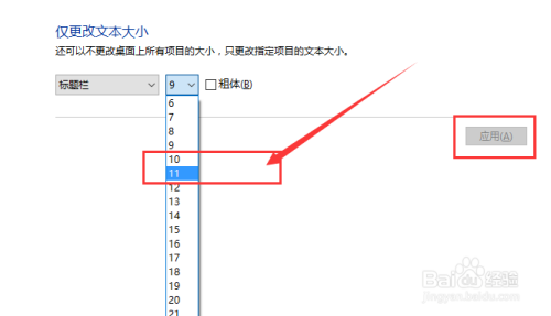 接下来,在右侧字体大小页面中,点击下拉菜单,然后点击字号大小设置,默认的字号大小为9号,若是想将桌面上的字体变年夜,只需要选择年夜一点的字号即可。