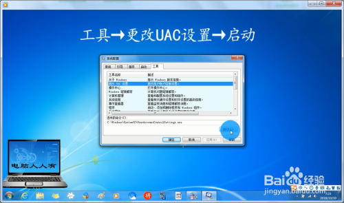 起头→运行→输入:msconfig→确定→打开系统设置装备摆设→东西→更改UAC设置→启动,也能打开UAC设置(账户节制)。