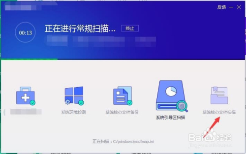 第五步:快速急救中系统焦点文件扫描就是扫描系统文件有没出缺少丢掉的环境,若是发现系统文件丢掉就可以直接进行修复。