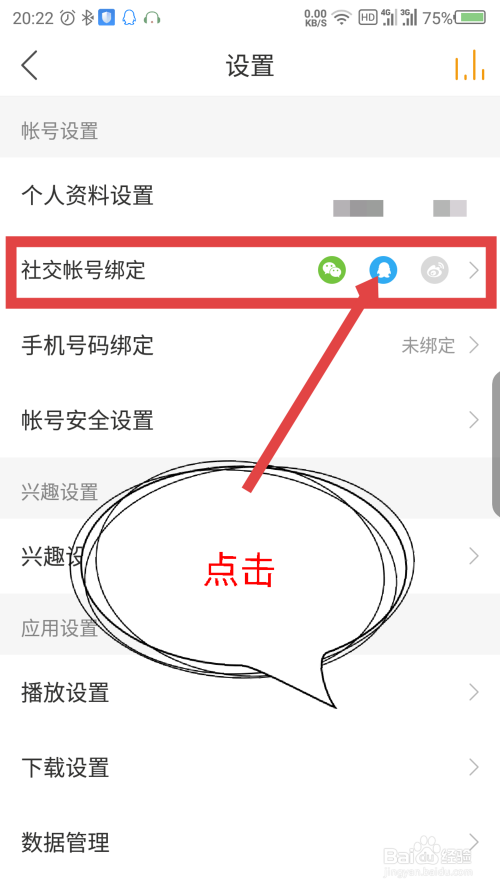 在打开的设置界面,上面第二个选项就是社交账号绑定设置,点击一下。如图所示