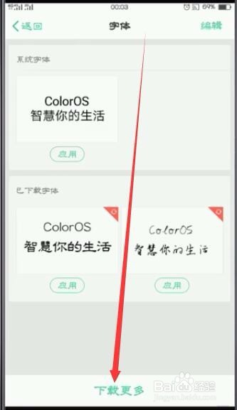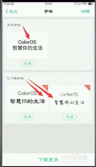 可看到本身手机系统字体和下载好的字体;如红色箭头偏向所指的字体;经由过程点击,可切换字体;