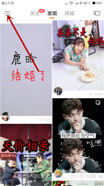 快手中想要删除存眷的人需要打开他的小我本家儿页,打开手机中的快手后点击左上角的【三】。