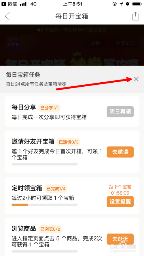 领取后,点击下图红色箭头所指的 x ,以便回到活动页面。