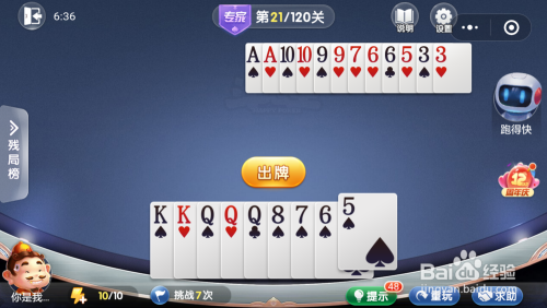 跑得快打出一对6,我打出一对K,接着打出一张Q就过关了。