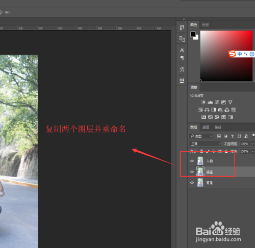 选中人物照片的布景图层,按键盘上的快捷键Ctrl+J复制两小我物照片布景图层出来,并别离将这两个复制的图层重定名为“人物”与“底座”。