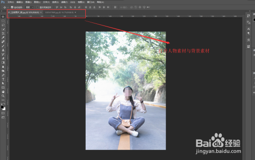 启动并打开PS软件,将我们找好的人物照片与布景素材都拖入到PS软件中进行打开,我们接下来先对人物照片进行出来,布景素材先不管。