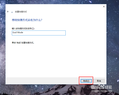 接下来,我们需要为该号令进行定名,因为是天主模式,所以可以直接输入天主模式的中文名或者是英文名,直接输入“God Mode”字符,然后点击确定按钮即可。