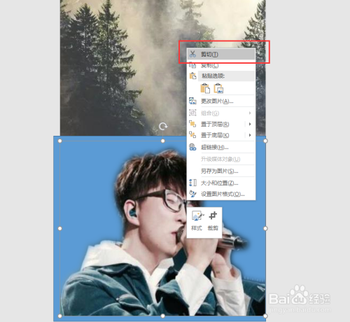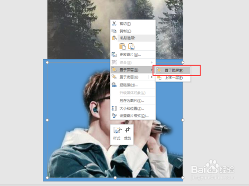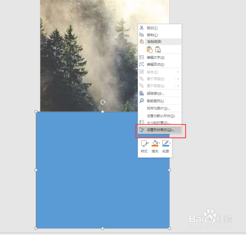 选中矩形,右键鼠标,执行设置外形格局号令,在呈现的设置格局号令窗口中,选择图片或纹理填充,选择剪贴板,然后透明度的数值,如许一个双重曝光的结果就呈现了。