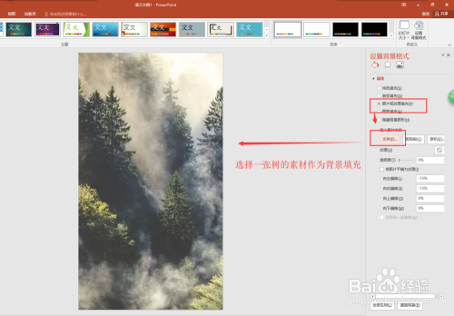 有幻灯片页上右键鼠标选择设置布景格局号令,在右侧弹出的设置布景格局窗口中选择图片或纹理填充,选择文件,然后将我们筹办好的一个素材图片作为布景导入。