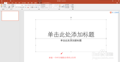 打开PPT 2016演示文稿软件,新建一个PPT文件,在新建打开的PPT2016中,拖动鼠标左键框选中PPT中自带的两个占位符框,按delete键将其删除。