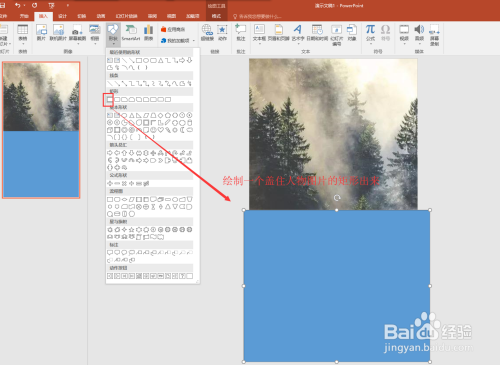 仍是在插入菜单中,找到外形号令,在浩繁的外形中找到矩形外形,然后选择矩形在幻灯片上绘制一个将人物素材完全笼盖住的矩形出来。