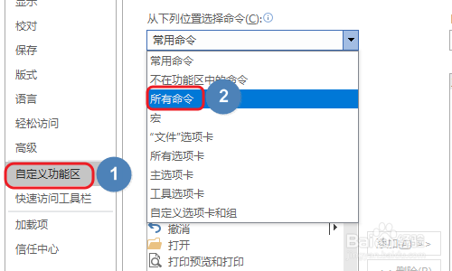 在对话框中点击左侧的“自界说功能区”,然后将号令更改为“所有号令”,然后在所有号令列表中找到“发送到Microsoft PowerPoint”,如图二所示...