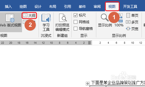 返回到文档之后,点击东西栏的“视图”-“纲领”,将文档设置为纲领浏览模式,然后纲领显示下方会看到一个品级显示的选框;