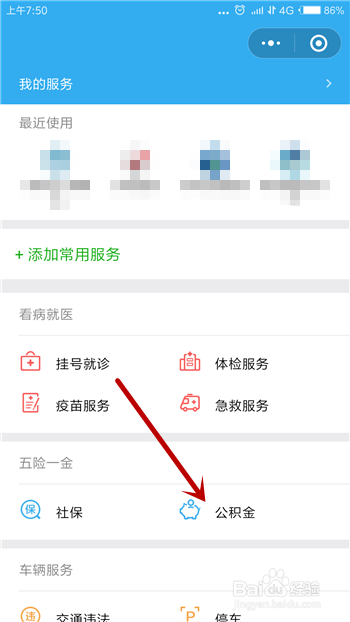 城市办事需要先定位到所要查询的公积金城市,然后鄙人方找到五险一金下的【公积金】并点击。