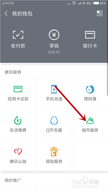 接下来在钱包的界面中就可以看到【城市办事】了,打开城市办事功能。