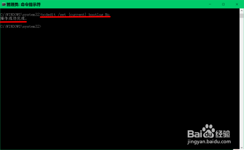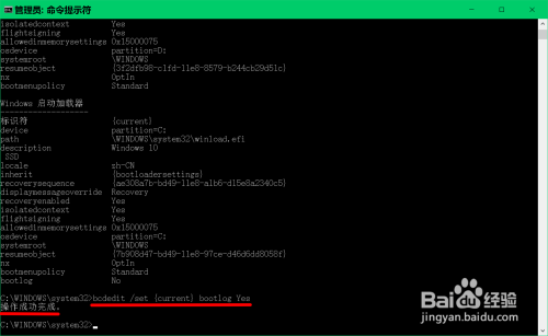 当 bcdedit /set {current} bootlog No 号令粘贴好今后,按下键盘上的回车键,显示: