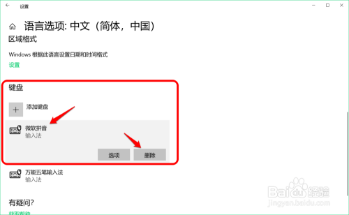 在说话选项:中文(简体,中国)窗口中的【键盘】项下点击【微软拼音】-删除;