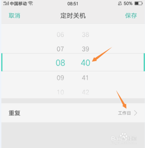 然后,点击开机在按时开机界面设置开机时候,并敲击反复一栏右侧天天旁边的“〉”图标,你会进入反复的设置窗口。
