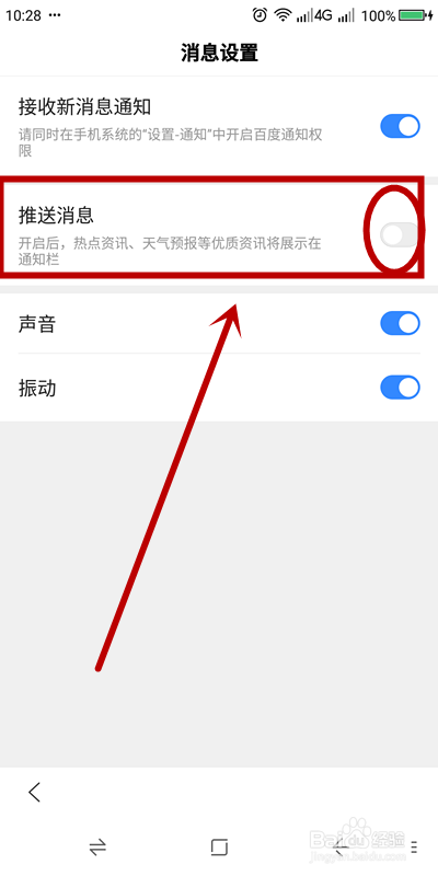 在动静设置页面,我们可以看到"推送动静”是默认打开的,后面的开关是蓝色,我们单击。开关酿成灰色,该功能封闭。