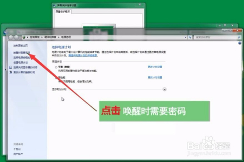 点击左下角的【更改电源设置】;在弹出的新的页面中点击左侧的【叫醒时需要密码】。