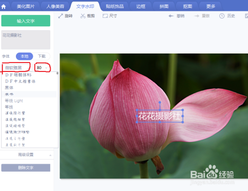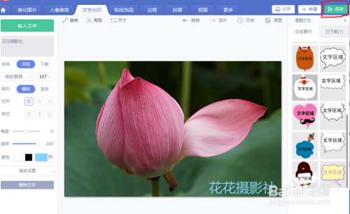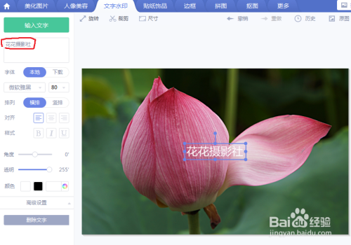 在”输入文字“按钮下方有一个文本框,我们在此输入水印文字,图片区域的文本框也响应呈现文字,如下图所示。小编输入”花花摄影社“。