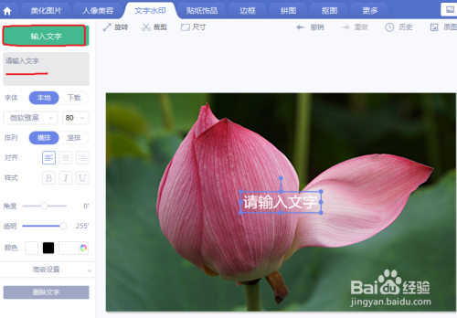 我们点击左上方的”输入文字“选项,这时图片区域会弹出一个”请输入文字“的文本框,如下图所示。