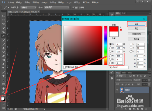 点击东西栏的前景色按钮,在拾色器面板中把数值设置为:R:255、G:0、B:0,即通用照片布景红色。