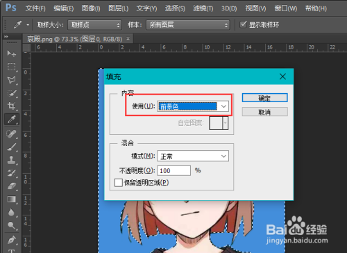 在对话框中选择利用“前景色”进行填充,点击确定。