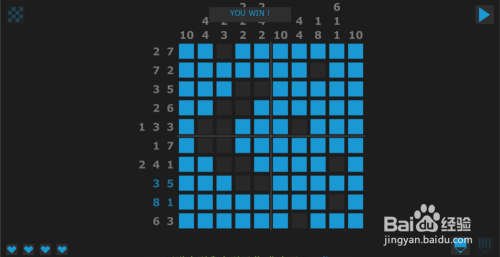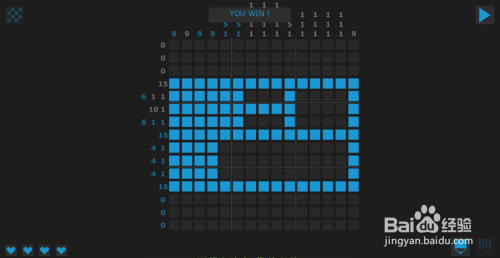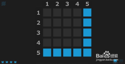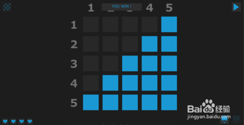 然后接下来就简单了,左侧的数字4代表这一行有持续4个需要点亮,又因为第四行第5列的格子已被点亮了,又要持续,所所以第四行2-5列的格子要点亮,按照这个纪律,依次点亮残剩格子,最后的外形是个楼梯。