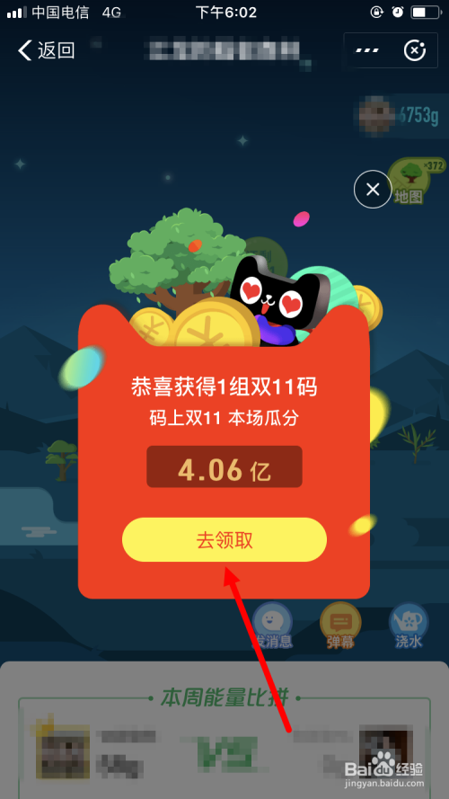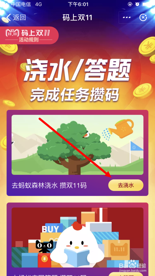在弹出的页面中显示:在11月1日至11月10日时代给老友或合种浇水,有机遇获得双11码,瓜分11.11亿。点击 去浇水吧 。
