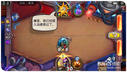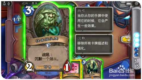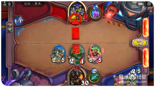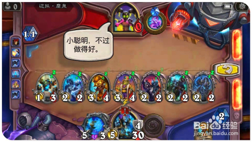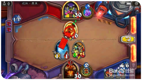打出手中牌“铁喙猫头鹰”,操纵战吼结果缄默已方“5/5荆刺谷猛虎”侍从,同时因为“苔原犀牛”的战吼结果,利用已方的野兽牌都具有冲锋结果,所以利用全数侍从别离进犯对方的英雄,最后再用英雄技术射对方英雄,即可将其斩杀过关。