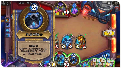 打黑锋骑士乌瑟尔,装备一把+5攻,+3血吸血兵器。用蓄电池组回复复兴法力水晶。用英雄的天启四骑士技术,呼唤出一个天启骑士,当呼唤出4个天启骑士时,将覆灭对方英雄。用黑樟林树精回复复兴英雄技术。第二次用天启四骑士技术,再次呼唤出一个天启骑士。打豪富翁比尔杜、蓄电池组,在回复复兴水晶的同时,回复复兴英雄技术;第三次用天启四骑士技术,呼唤出第三个天启骑士。用愤慨之锤覆灭失落格洛顿,回复复兴英雄技术,第四次天启四骑士技术,呼唤出第四个天启骑士,覆灭敌方英雄。