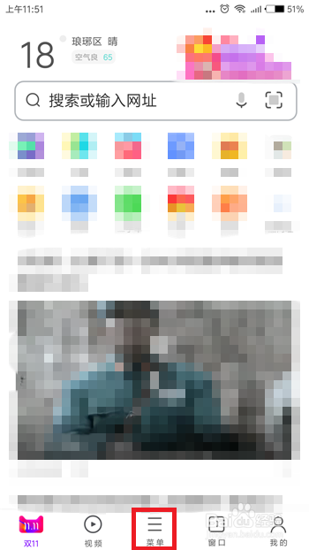 打开手机中的UC浏览器,在UC浏览器首页中点击底部的【菜单】选项。