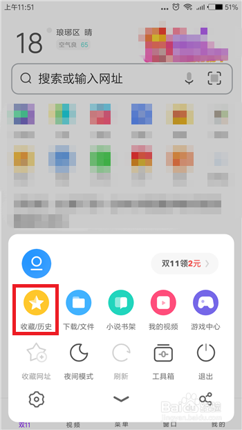 点击后会在底部呈现一个界面,找到此中的【保藏/汗青】选项并点击。
