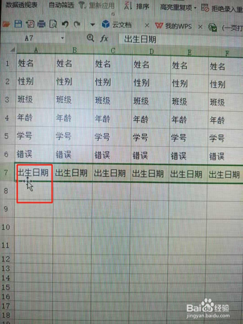 选中出生日期地点行,按住Shfit键,将鼠标放在选中行的下鸿沟线处,直至酿成四角外形