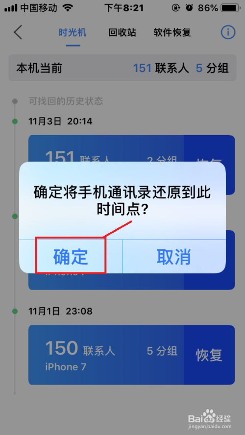 点击右上角“月光宝盒”图标,选择通信录恢复时候点,点击“恢复”,即可恢复前面某个时候点的“通信录”。