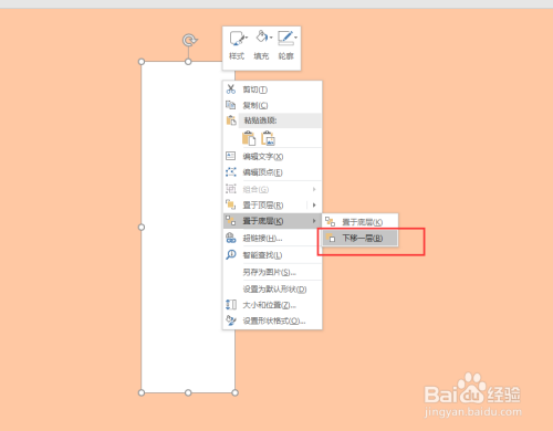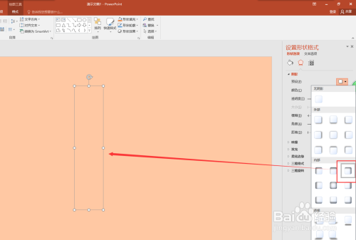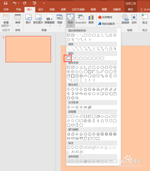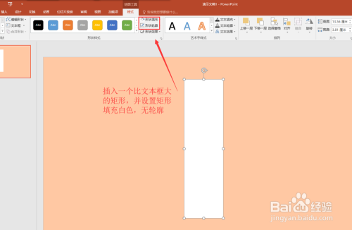 在插入菜单中找到外形号令,在外形中选择矩形外形,然后在幻灯片页上绘制一个矩形条出来,矩形条的大小要比文本框稍微年夜一点;并设置该矩形的填充颜色为白色,轮廓颜色为无颜色。
