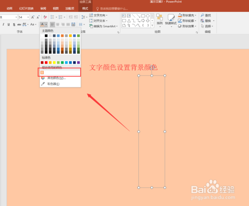 选中整个文本框或者是选中文本框中的全数文字,在开始菜单中设置文字的颜色,在这里将文字的颜色设置与幻灯片布景的颜色一致,如许文字就看不见了。