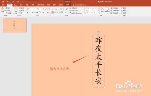 在插入菜单栏中找到文本框东西,点开文本框东西在此中选择竖排文本框;然后在幻灯片页上插入一个竖排文本框,并在此中输入文本内容。