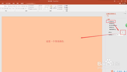 打开或建立一个新的PPT,然后在新的PPT的幻灯片上右键鼠标,执行设置布景格局号令;然后在打开的设置布景格局窗口中为当前的幻灯片设置一个纯色的颜色填充。
