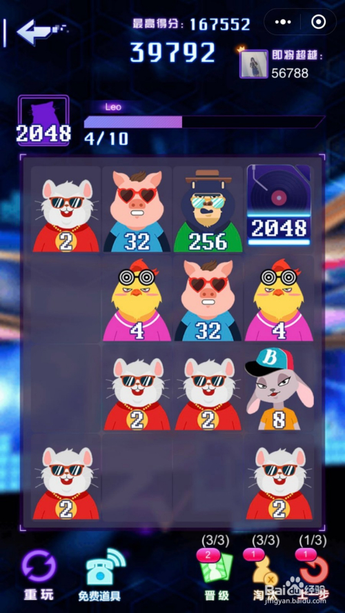 第一步:想要获得高分,首先我们要领会根基的游戏法则:4×4的格子,打开就会呈现两个带数字的小动物,上下摆布滑动屏幕,两个数字不异的数字就汇合二为一酿成新的带数字的动物,如图两个2合当作了数字4