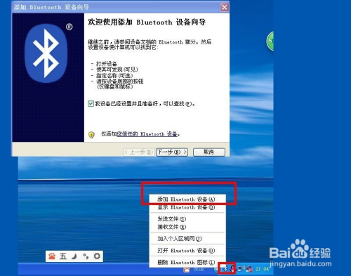 第四步,安装完当作之后,在电脑状况栏的右侧就会呈现一个蓝牙的图标,点击该图标——然后在弹出的选项中选择添加Bluetooth设备——这时会弹出要打开蓝牙设备才能搜刮添加,然后勾选:我设备已经设置而且筹办好,可以查找——点击下一步。