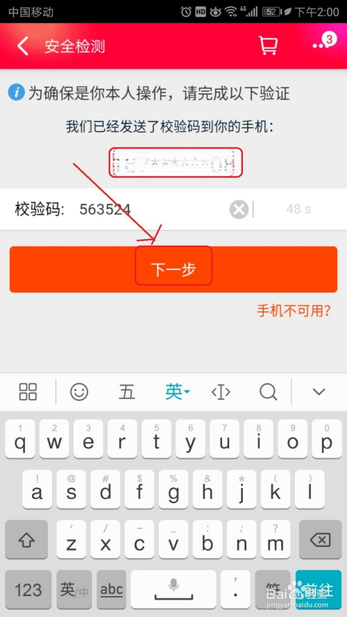 然后进行平安检测并发送绑定手机号的接收验证码填入框中并点击下一步按钮。
