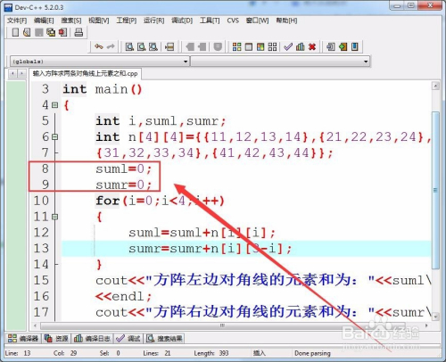 首先,界说3个整型变量,保留节制数组元素的变量,以及左侧对角线元素的和、右侧对角线元素的和。