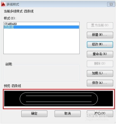 选择【格局】│【多线样式】号令,弹出【多线样式】对话框,选择新建的“四条线”多线样式,预览如下图,点击“点窜”。